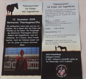 Nikolaus-Reitertag Veröffentlicht am 2025-10-20 von Verbandadmin Der Reitverein Thierhaupten veranstaltet am 13.Dezember einen adventlichen Reiternachmittag mit Nikolausbesuch.